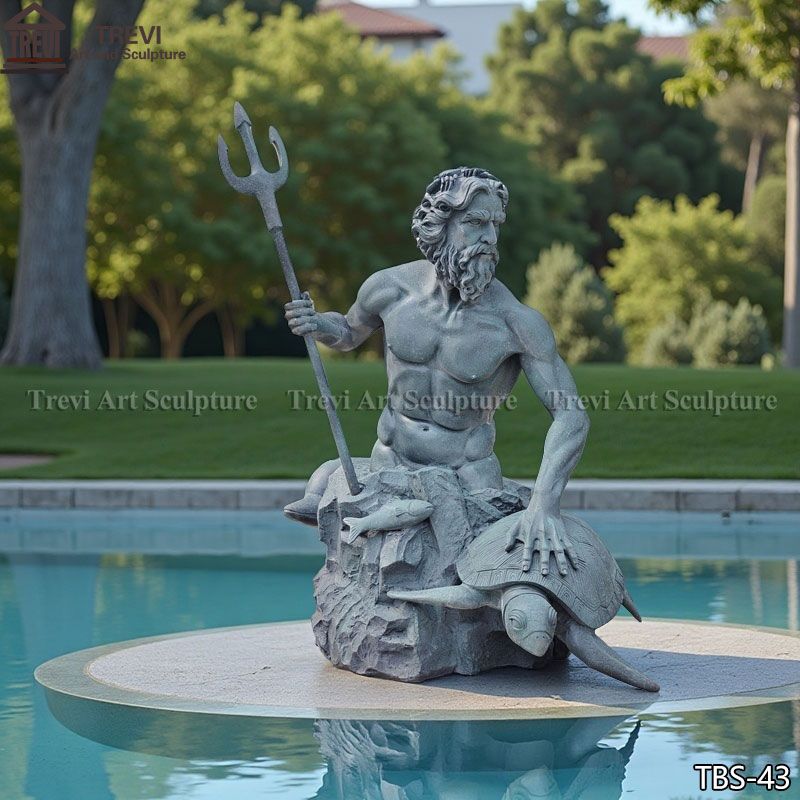 The statue is inspired by the classic Poseidon shape, holding a trident symbolizing authority, with a majestic and solemn expression, showing the power and wisdom of Poseidon to rule the ocean. The base of the statue is decorated with rich marine elements, including vivid images of turtles, dolphins, and sea fish.