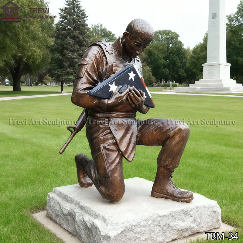 This sculpture expresses a profound tribute to the loyalty, sacrifice, and patriotism of military service. The image of the kneeling soldier symbolizes mourning for fallen comrades, commitment to one’s country, and a prayer for peace. This is a monumental work of art with a powerful resonance, ideal as a centerpiece for veterans’ memorials, military bases, public squares, and other venues.