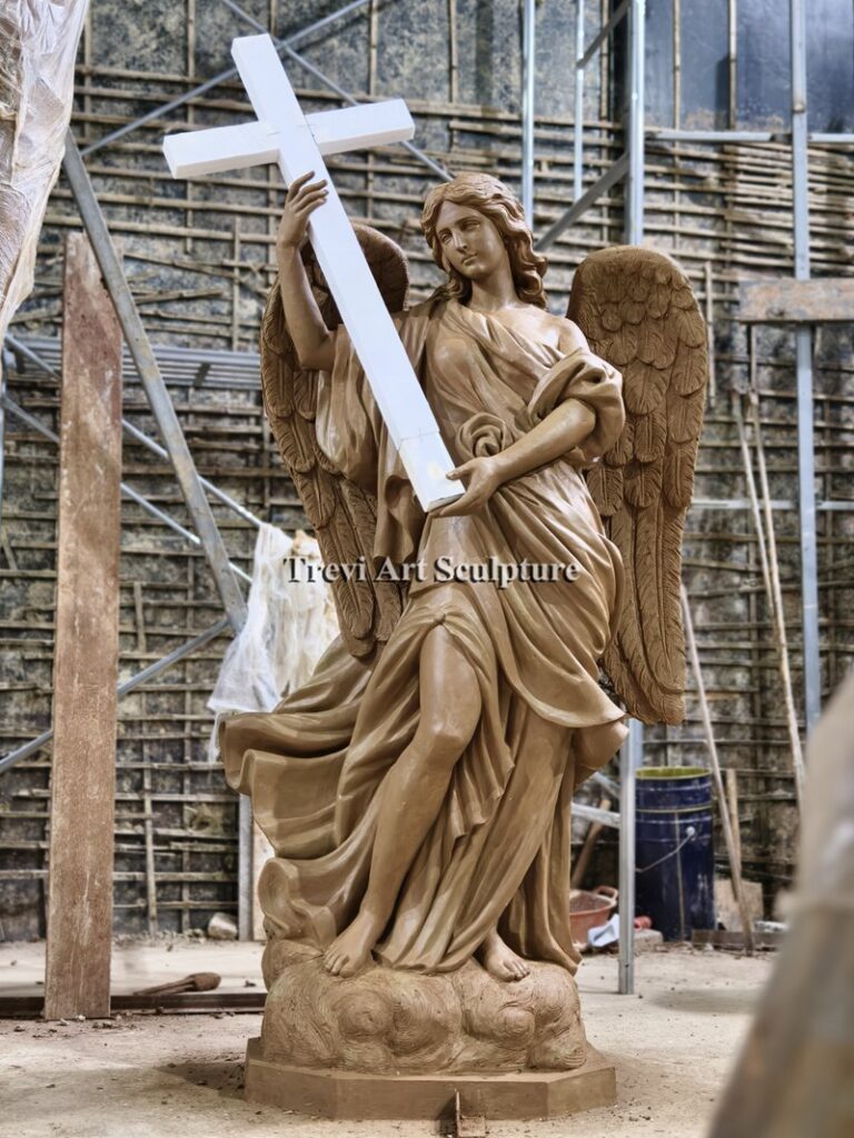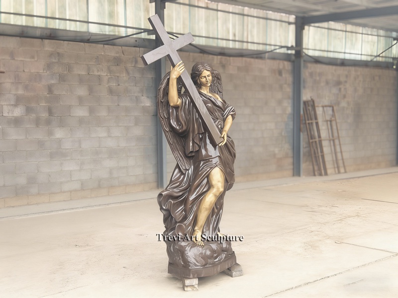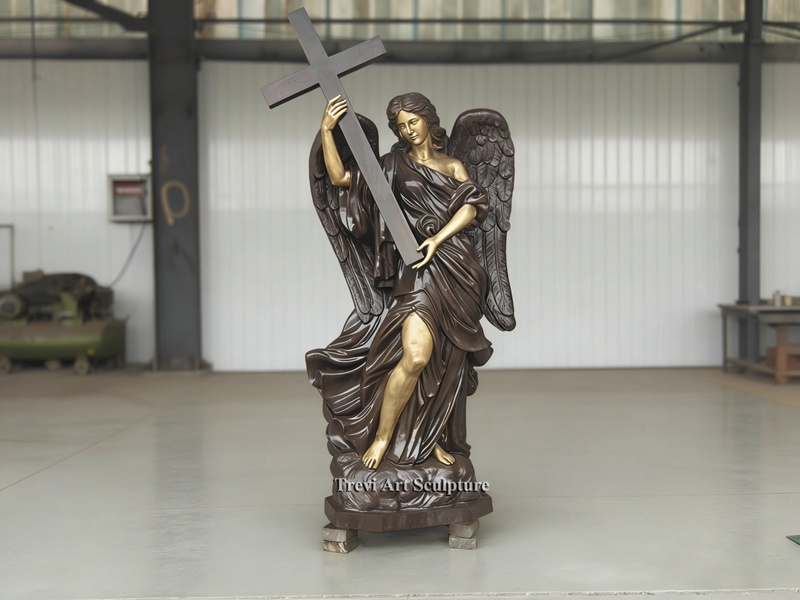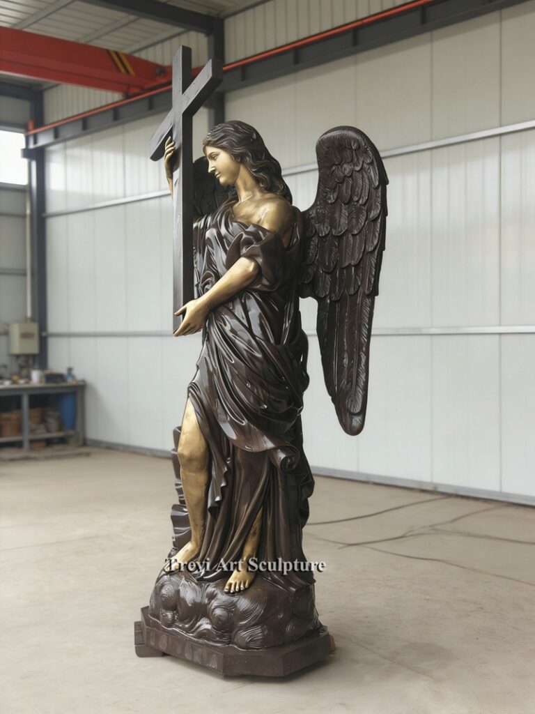 Installed on the right side, the angel sculpture holding a cross is both powerful and symbolic.