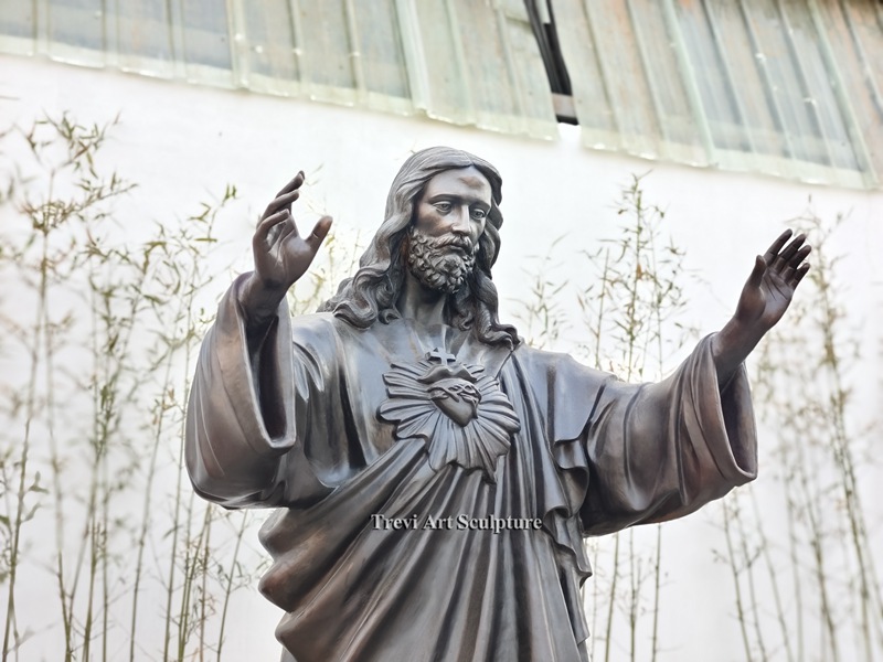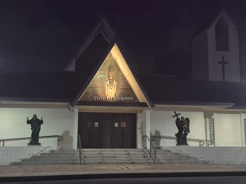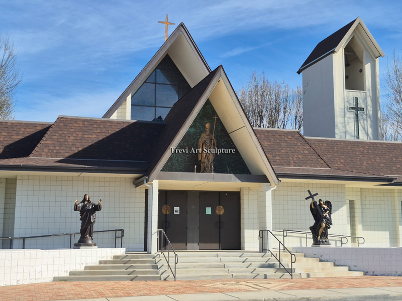 Placed on the left side of the church entrance, the bronze Jesus statue is designed with open arms, symbolizing welcome, compassion, and forgiveness.
