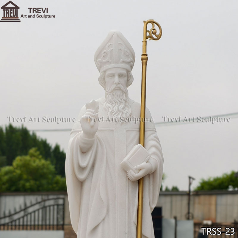 The statue is intricately detailed, from St. Patrick’s bishop’s attire to the crozier he holds. The textures, folds, and expressions bring the saint’s character to life. The base is also carved with care, adding elegance and stability to the entire piece.