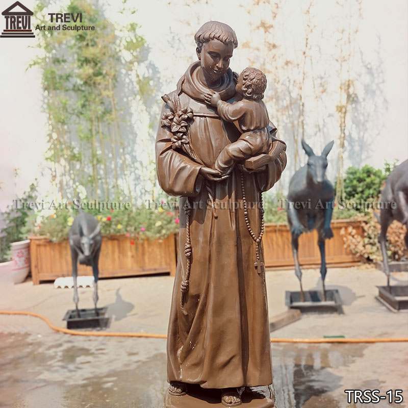 This large bronze St Anthony statue holding Jesus is 1.8 meters (about 70.9 inches) tall, vividly restoring the classic image of Saint Anthony holding the baby Jesus. Saint Anthony is a deeply revered saint in Catholicism, known for his kindness, wisdom, and good deeds of intercession for the poor. This sculpture conveys a warm religious emotion, symbolizing Saint Anthony’s endless love and faith in Christ.