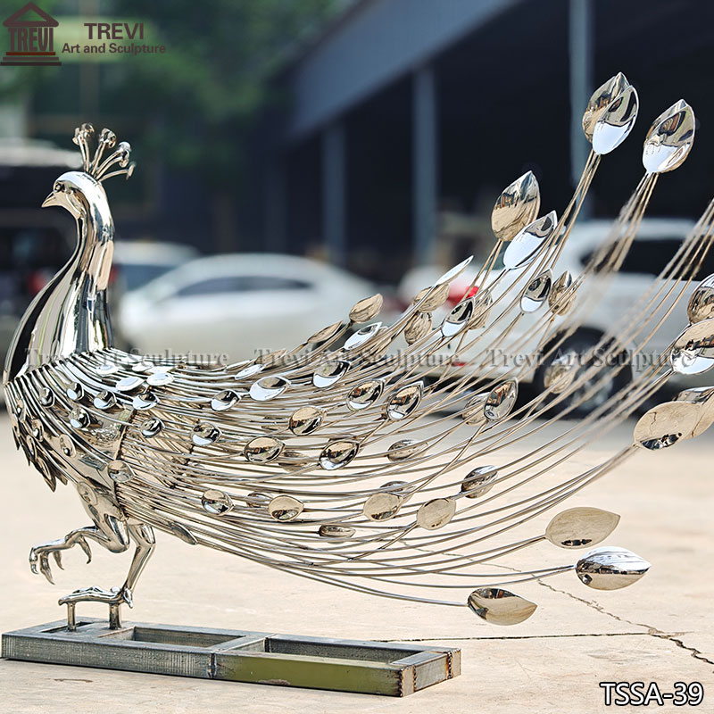 Feathers: The peacock’s elaborate tail feathers are skillfully crafted with a flowing, dynamic design, showcasing a modern and artistic interpretation of the bird’s iconic plumage. The polished surfaces create dazzling reflections, adding brilliance to any environment.