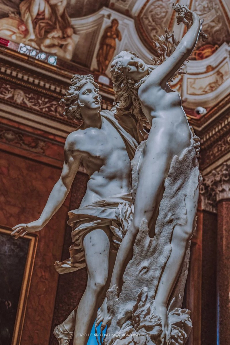 Bernini’s Apollo and Daphne tells the myth of Daphne’s transformation into a laurel tree to escape Apollo. The transition is frozen in marble — fingers sprouting