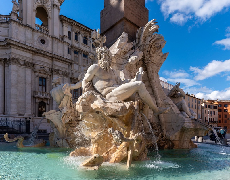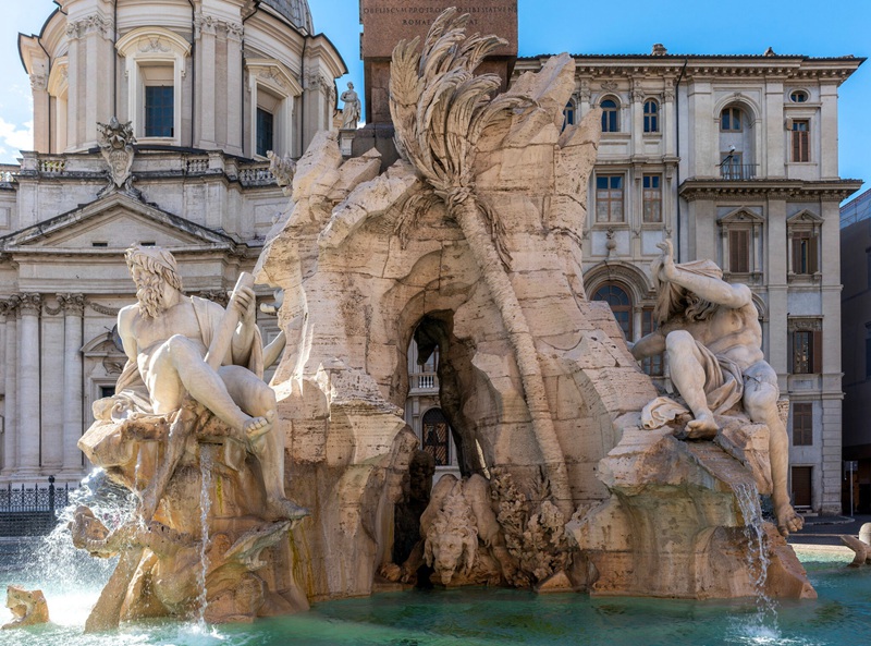 Another Bernini masterpiece, this monumental fountain represents the world’s great rivers — the Nile, Danube, Ganges, and Rio de la Plata — personified as powerful river gods. The swirling composition symbolises the vitality of nature and God’s creation.
