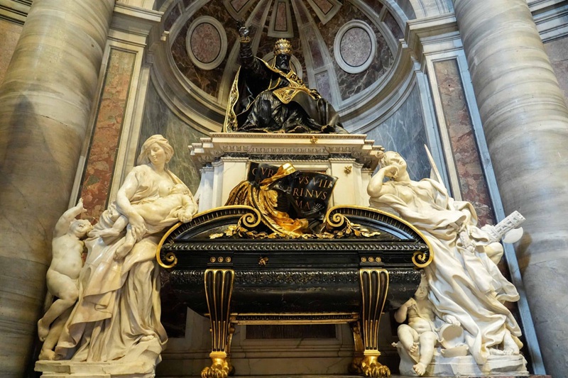 Designed by Bernini, this grandiose tomb combines sculpture, architecture, and symbolism. The bronze and marble figures, including a skeletal figure of Death writing the Pope’s name, reflect the Baroque fascination with mortality and the afterlife.