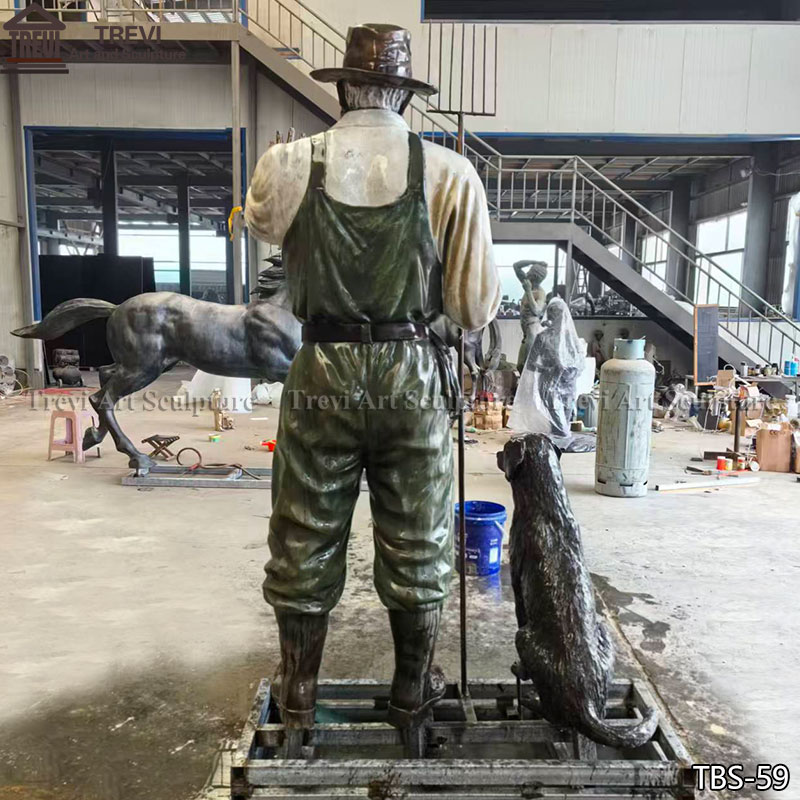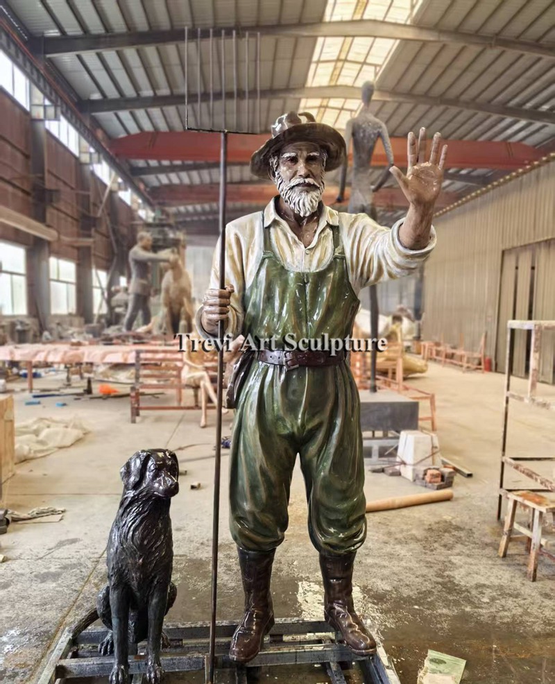 This bronze farmer statue captures the essence of rural life, featuring a farmer holding a pitchfork, accompanied by his loyal dog.