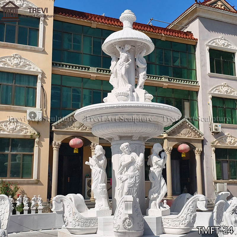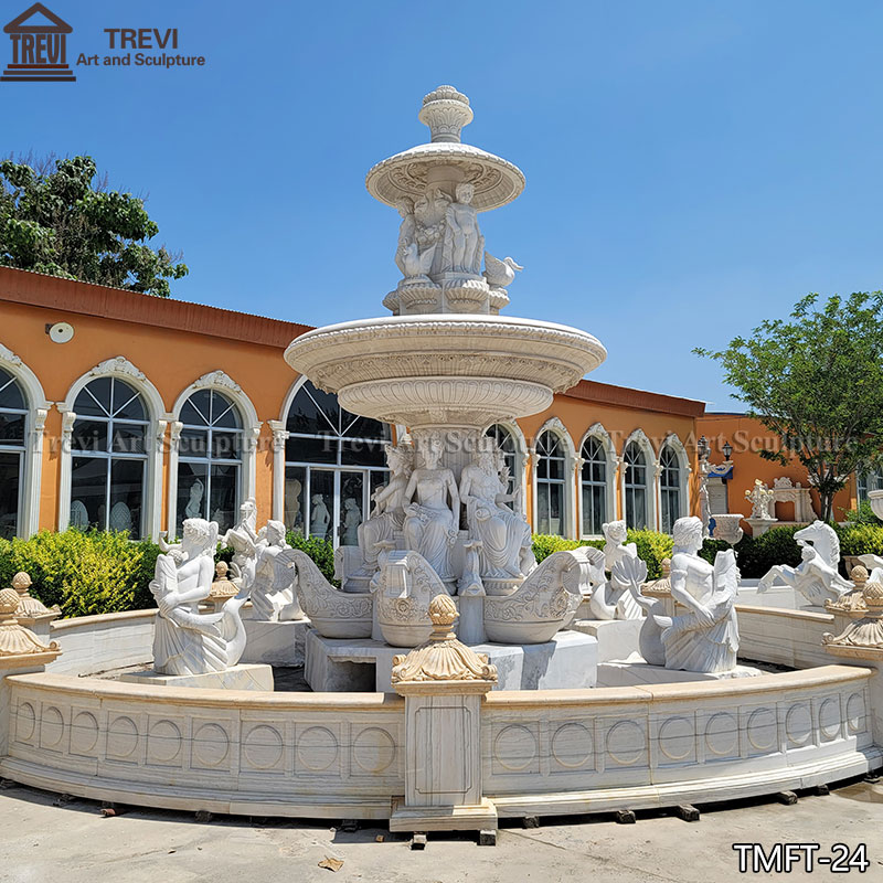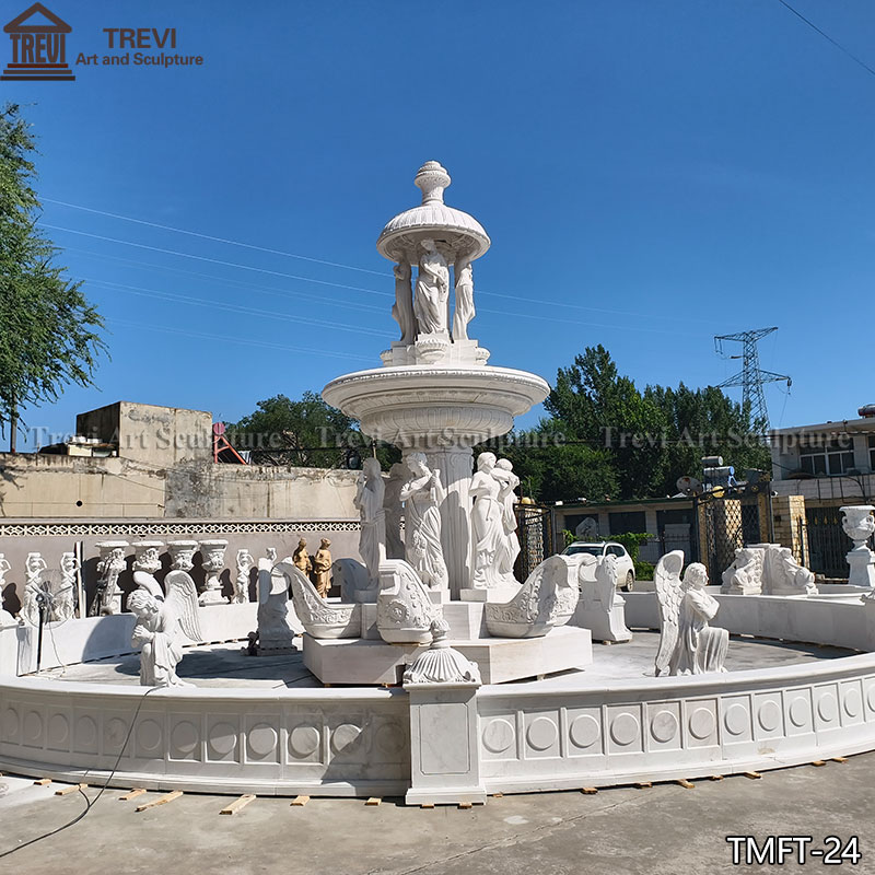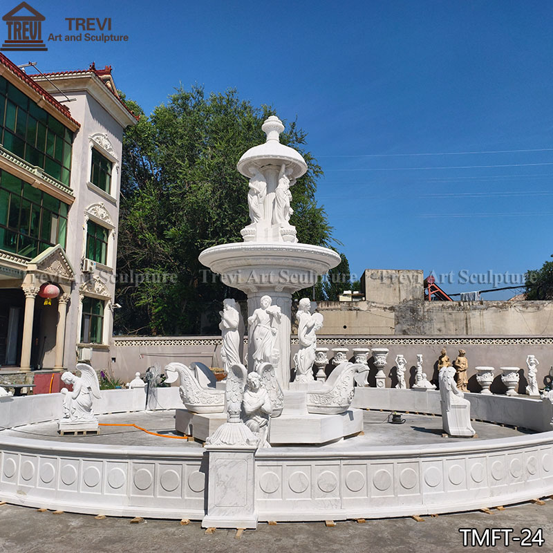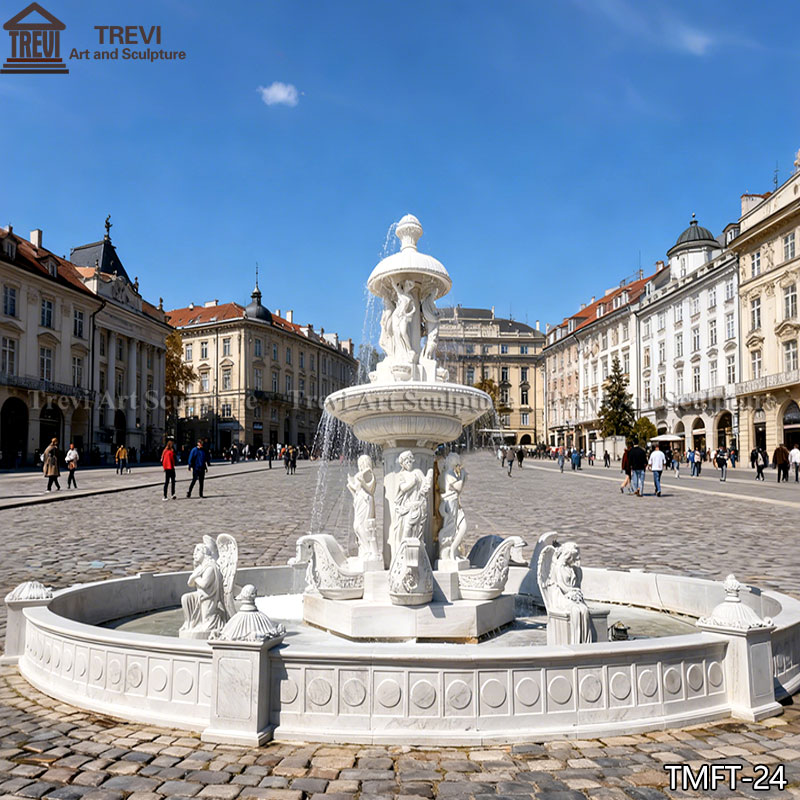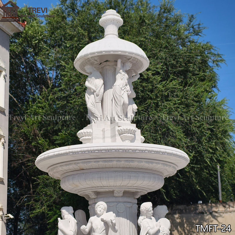 The fountain features three impressive tiers, each showcasing masterful artistry. Angel sculptures surround the base, adding a touch of grace and serenity.