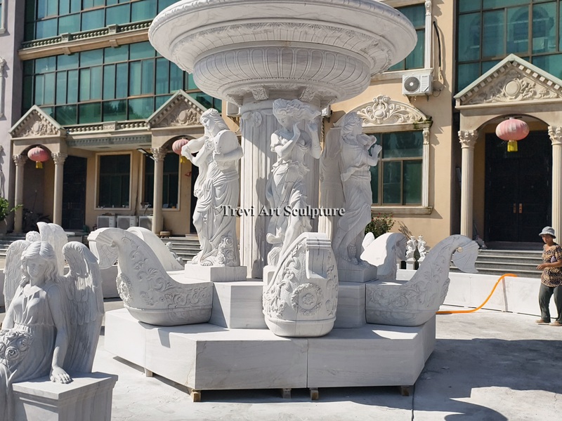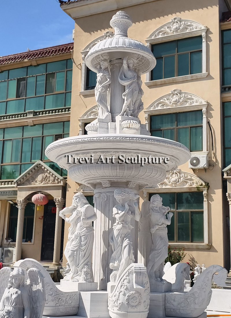 At the very top, the Four Seasons statues stand majestically, each representing a season with exquisite detail and elegance. The precise carving and flowing design of the sculptures make this fountain a true work of art.