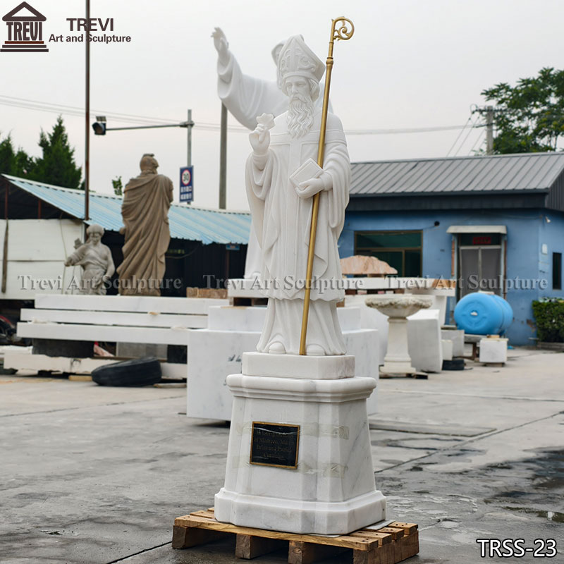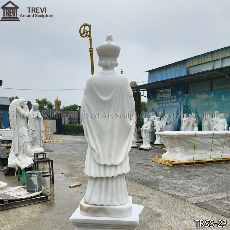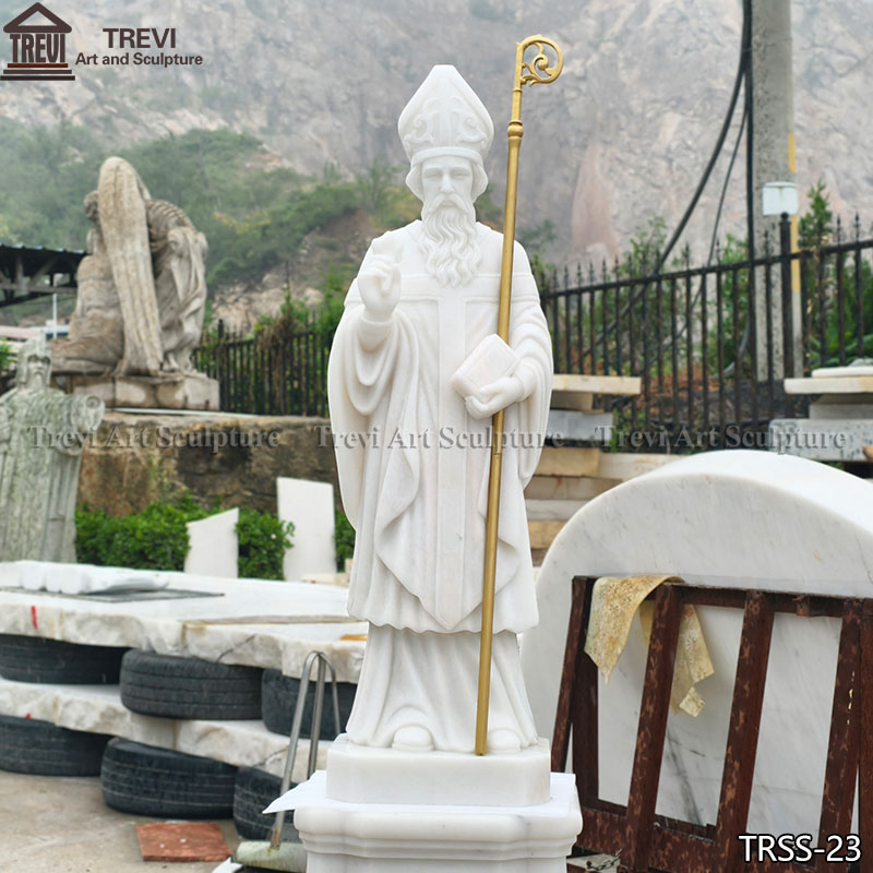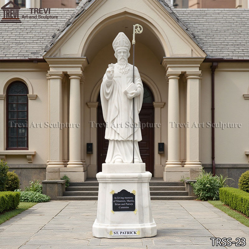 This St. Patrick marble statue is hand-carved from natural marble, showcasing exquisite craftsmanship, perfect for churches, gardens, or religious spaces.