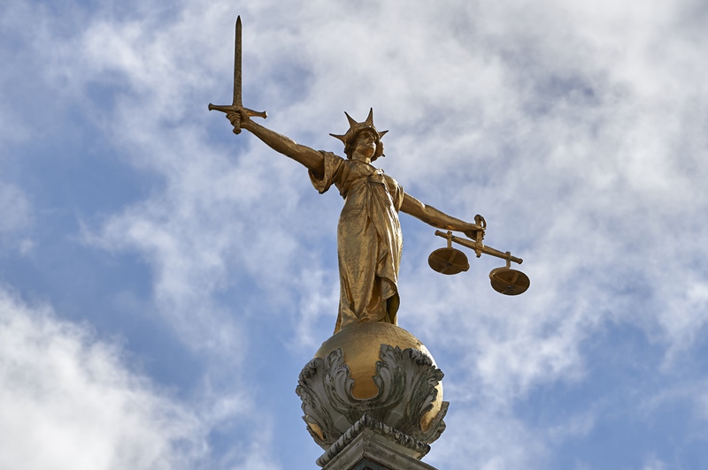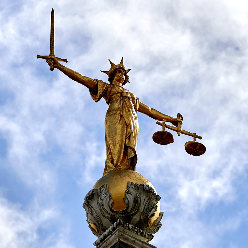 The “Lady of Justice”, a 12-foot-high, gold-leaf statue, is pictured on top of the dome of the Central Criminal Court, commonly referred to as The Old Bailey, in central London
