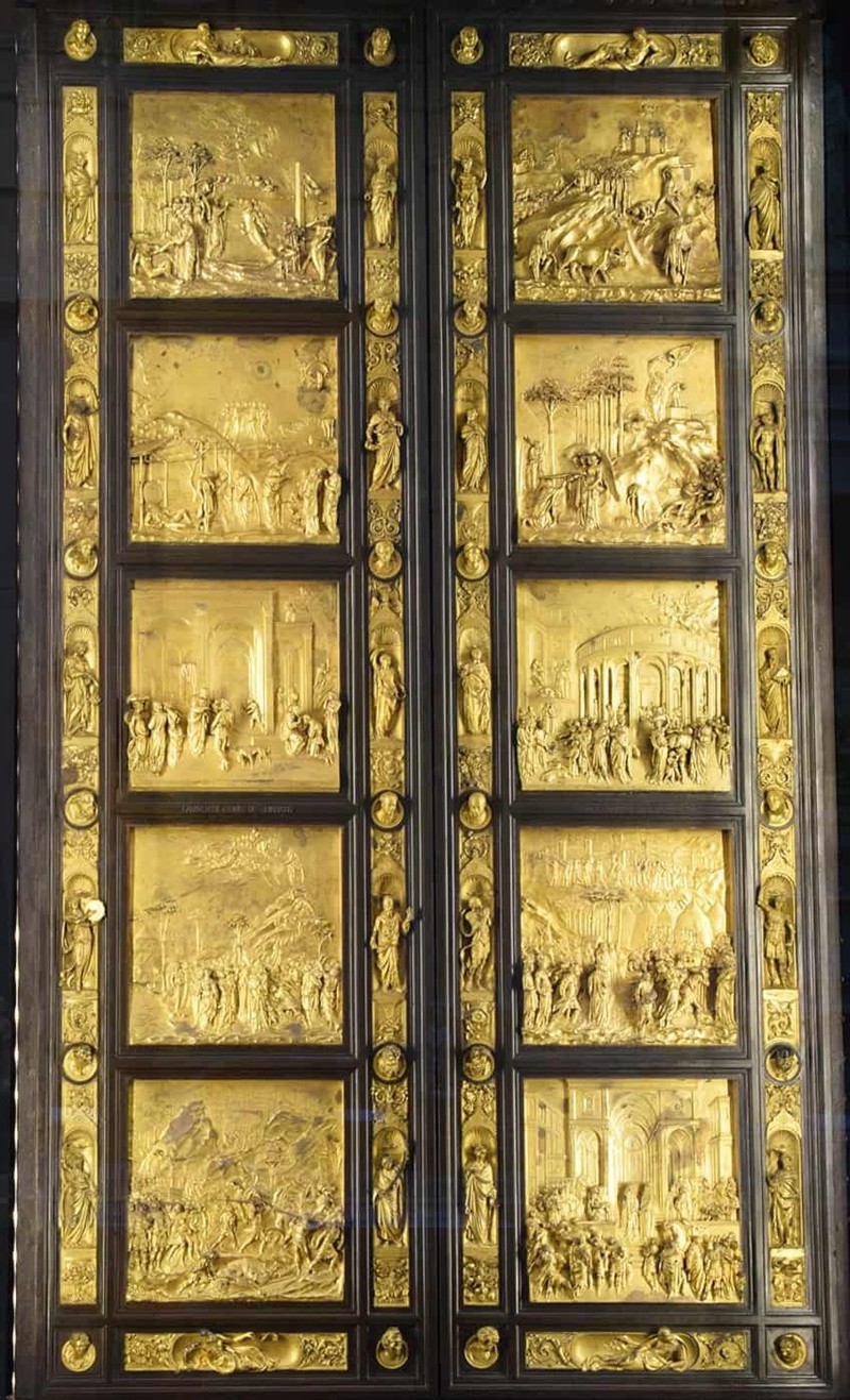 The Gates of Paradise consist of ten large panels, each depicting a scene from the Old Testament. These panels are surrounded by intricate frames that include smaller biblical figures, prophets, and decorative motifs. The ten scenes are arranged in two vertical rows of five and include: