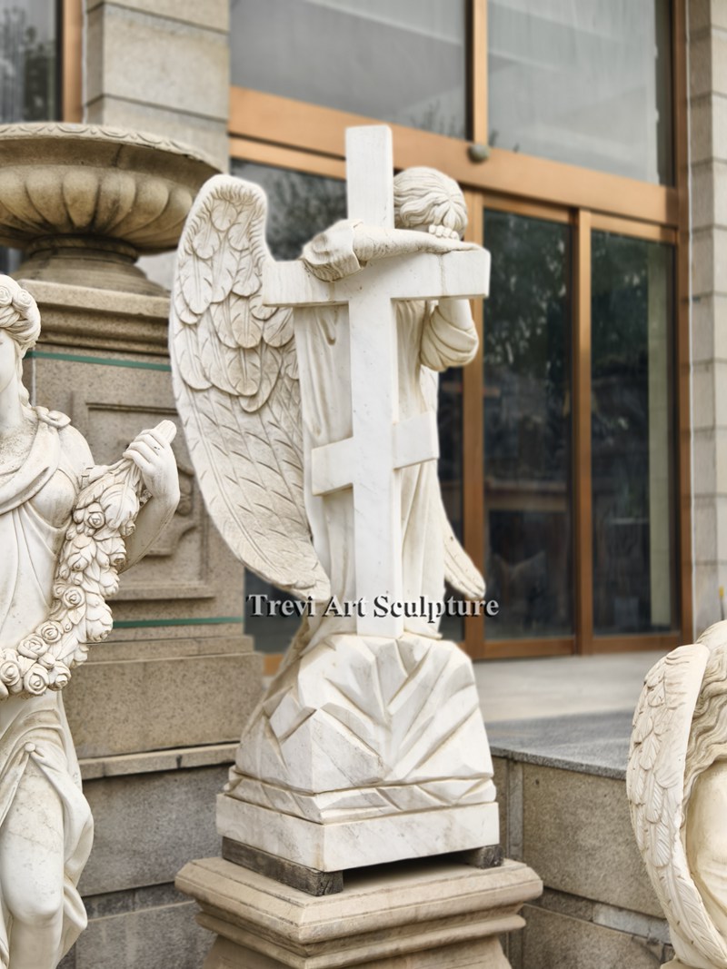 In this statue, the angel leans against a cross, her face hidden in her hands as if mourning. This poignant design offers a powerful expression of grief and faith.